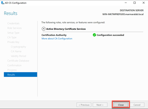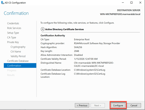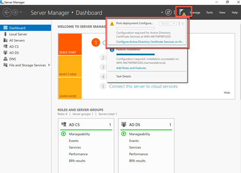 Server Manager bölümünden “Configure Active Directory Certificate Services”” seçilir.