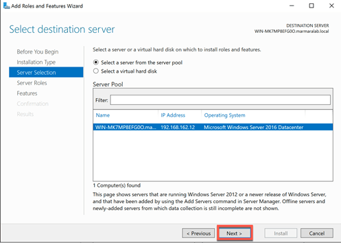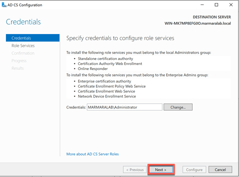Credential bölümünden Domain Admin yetkisine sahip kullanıcısı seçilir. Next seçilerek yapılandırmaya devam edilir.