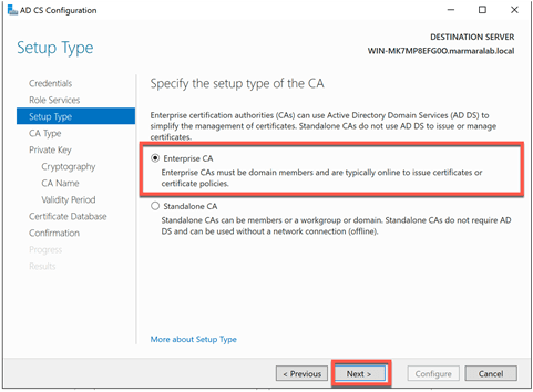 Setup Type bölümünde “Enterprise CA” seçilir. Next seçilerek yapılandırmaya devam edilir.