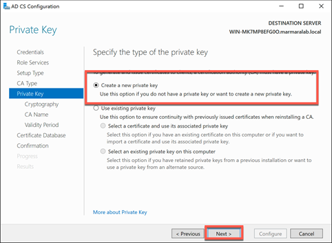 Private Key oluşturmak için “Create a new private key” seçilir. Next seçilerek yapılandırmaya devam edilir.