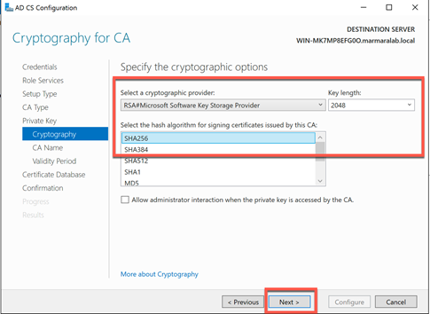 Oluşturulacak serfikanın hash algoritması SHA-256 seçilir. Key uzunluğu 2048 olarak ayarlanır. Next seçilerek yapılandırmaya devam edilir.