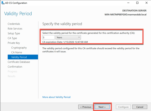 Root Sertifika yenileme süresi 5 yıl olarak seçilir. Next seçilerek yapılandırmaya devam edilir.