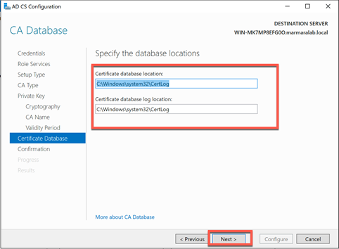 Sertikanın veritabanın kurulacağı dosya dizini seçilir. Next seçilerek yapılandırmaya devam edilir.