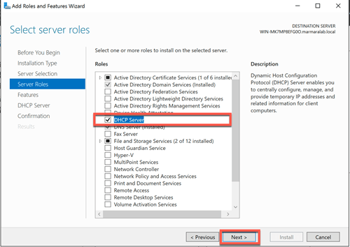 İstemcilerin otomatik olarak IP alabilmeleri için DHCP sunucu gerekmektedir. Bunun için DHCP Server rolelerini sunucuya ekleyeceğiz. Bu rolleri isterseniz farklı sunuculara da verebilirsiniz.