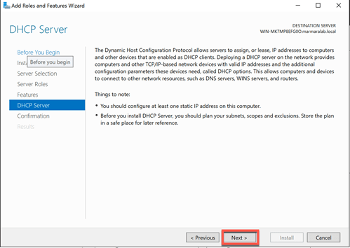 Server Role bölümünde DHCP Server seçilir. Next seçilerek kuruluma devam edilir.