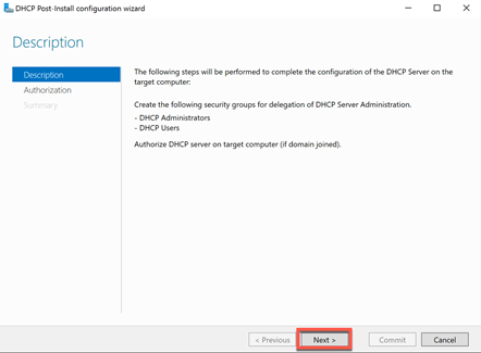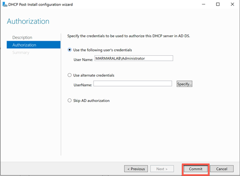 Authorization bölümünde DHCP Server Domain içinde IP dağıtması için yetkilendirilir. Commit denilerek yetkilendirme uygulanır.