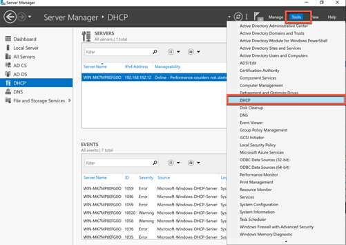 DHCP Server yetkilendirilmesinden sonra IP dağıtma yapılandırması için Scope oluşturulmalıdır. Bunun için Server Manager bölümünden DHCP seçilir.