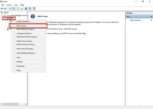 DHCP Server yönetim arayüzünden IPv4 seçilerek New Scope seçeneği seçilir.