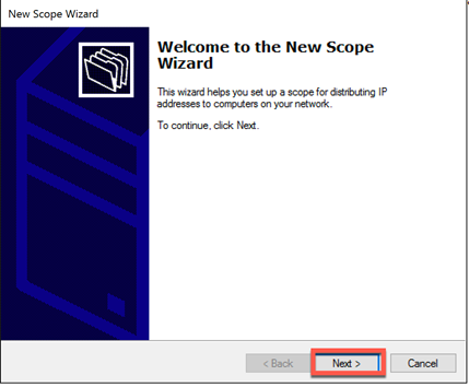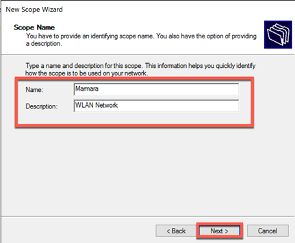 Açılan New Scope Wizard üzerinde Scope Name adımında Name alanına Scope için ismi veilir, Next seçilerek yapılandırmaya devam edilir.