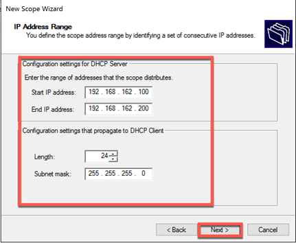 Ip Address Range bölümünde dağıtılacak IP adres aralığı ve subnet mask değerleri belirlenir. Next butonuna tıklayarak işleme devam edilir.