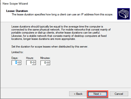 Lease Duration adımında, dağıtılan IP adreslerinin IP adreslerini alan Client’larda ne kadar süre kalacağını belirleyen Lease Time‘dır (kira süresi). Varsayılan olarak 8 gündür. Kablosuz ağlarda bu değer 8 saat olarak değiştirmelidir. Next seçilerek yapılandırmaya devam edilir.