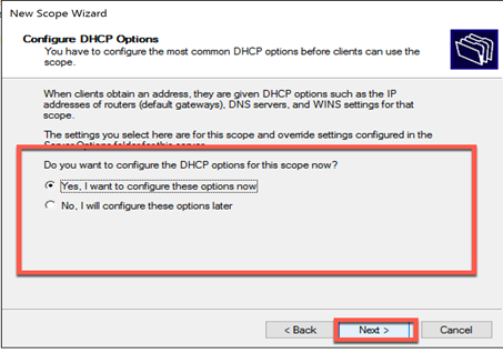 Configure Options adımı ise, oluşturuduğmuz Scope ile ilgili ayarların hemen yapılıp yapılmacağının sorulduğu adımdır. Yes, I want to configure these options now seçeneği seçilerek Next seçilerek yapılandırmaya devam edilir.