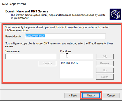 Domain Name bölümünde ağda bulunan DNS Server adresleri yazılır. Next seçilerek yapılandırmaya devam edilir.