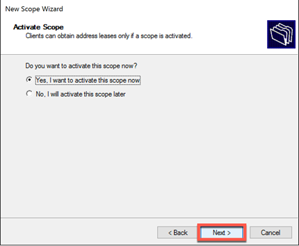 Active Scope bölümünde IP dağıtma yapılandırmalarının aktif edilmesi seçilir. Next seçilerek yapılandırmaya devam edilir.