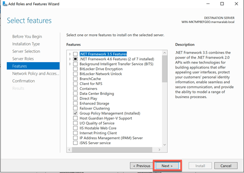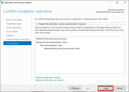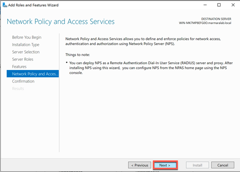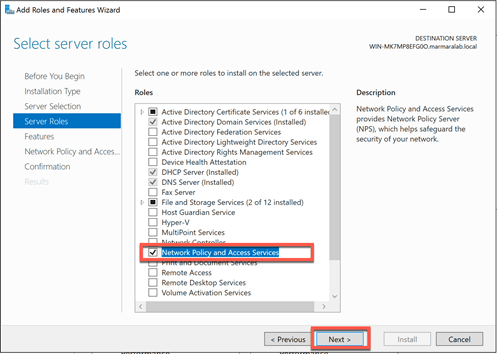 Server Role’lerinden Network Policy And Access Services seçilir. Next seçilerek kuruluma devam edilir