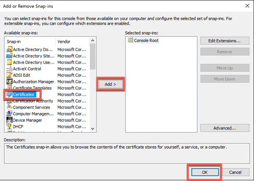 MMC konsolda File>Add/Remove Snap’inden certificates seçilir.