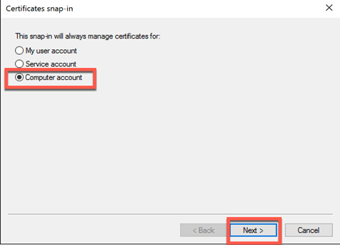 Certificates Snap’in’den Computer account seçilir. Next seçilerek yapılandırmaya devam edilir.