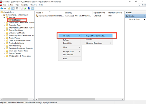 Personal > Certificates bölümünde All Task’dan Request New Certificate seçilerek yeni sertifika isteği oluşturulur.