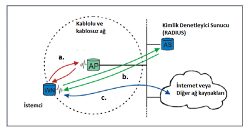 - Başarılı bir kimlik kanıtlamadan sonra istemci cihaz yetkisi bulunan diğer yerel ağ kaynaklarına ya da internete erişmeye hak kazanır[5].