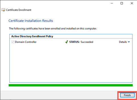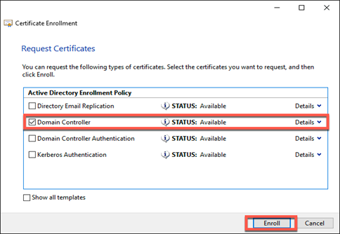 Certificate Enrollment bölümünde Domain Control seçilir. Enroll seçilerek sertifika oluşturma işlemi başlatılır.