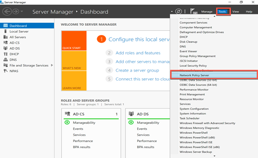 Server Manager bölümünden Tools’dan Networık Policy Server seçilerek NPS konsol başlatılır.