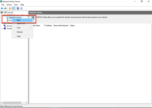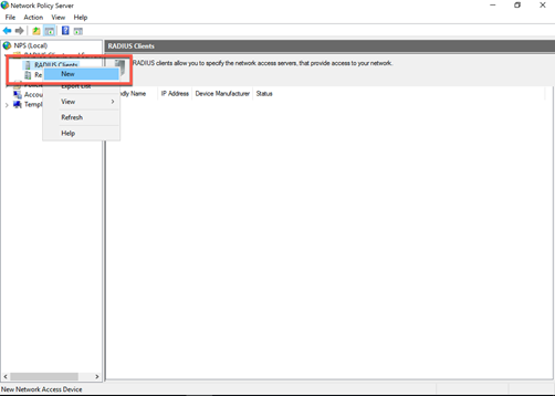 NPS Server üzerinde Access Point’lerin/WLC’lerin NPS Server iletişim kurabilmesi için Radius Client yapılandırması yapılmalıdır. Bunun için Radius Client bölümünden yeni Radius client oluşturulur.