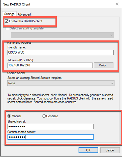 New Radius Client bölümünde “Enable this Radius Client” seçilerek Radius client aktif edilir. Friendly Name ile Radius client’a bir isim verilir. Adress bölümünde ise Cisco Wireless Controller IP adresi yazılır. Shared secret ise WLC ile Radius Client arasındaki trafiğim şifrelenmesi ve doğrulanması için kullanılacaktır. OK butonuna tıklanarak Radius Client yapılandırması tamamlanır.