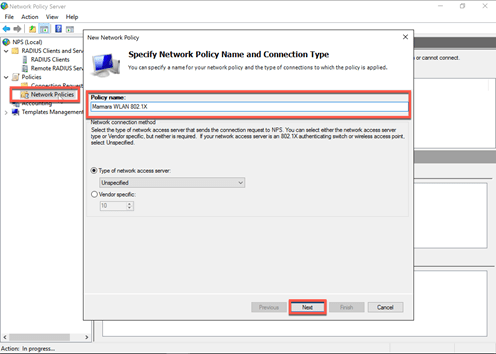 NPS Server üzerinde 802.1X yapılandırması için Network Politikası oluşturmalıdır bunun için Network Policies’de New tıklanarak yeni bir politika oluşturulur. Policy Name‘e politika adını yazıyoruz. Next seçilerek yapılandırmaya devam edilir.