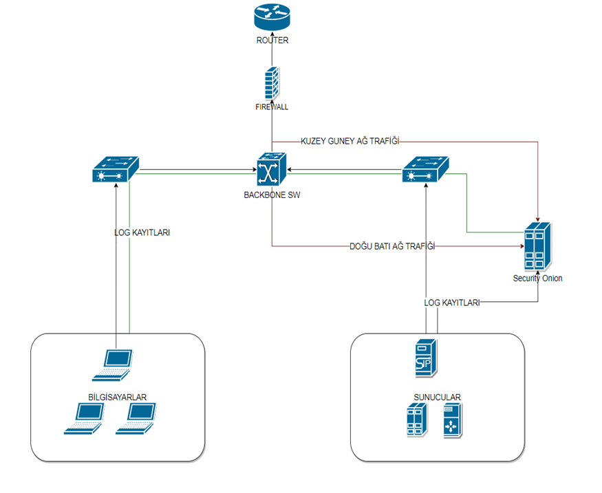 Şekil 2.1’de, güvenlik duvarı, iş istasyonları ve sunucuları olan geleneksel bir kurumsal ağda Security Onion mimarisi verilmiştir. Bir ağa giren, komuta ve kontrol sunucuları veya bir saldırganı tespit etmek için kuzey / güney trafiğini izlemek ve yanal hareketleri tespit etmek için doğu / batı trafiğini de izlemek gerekir. Ağ trafiği giderek daha fazla şifrelenirken, bu kör noktaları uç nokta görünürlüğü ile ek görünürlükle doldurmak önemlidir. Security Onion, sunucuları ve iş istasyonları günlüklerini okuyabilir, böylece tüm ağ ve sunucu günlükleri aynı anda incelenerek tehdit avcılığı yapılabilir.