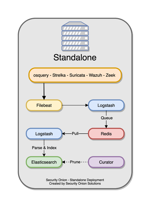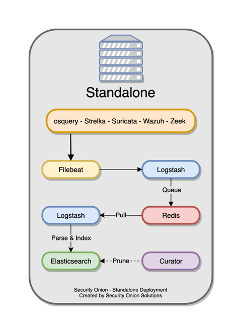 Security Onion kuruluma başlamadan önce belirlenmesi gereken konu, nasıl bir yapı kurulacağıdır. Security Onion bağımsız ve dağıtık mimariyi düğüm (node) kümeleme (cluster) yapısını desteklemektedir. İlk kurulumda master node (ana yönlendirici) olarak kurulan security Onion dağıtımı daha sonra forward node (yönlendirici düğüm) olarak isimlendirilen kurulumları yapılabilmektedir. Şekil 3.1’de Security Onion bağımsız mantıksal mimarisi görülmektedir.