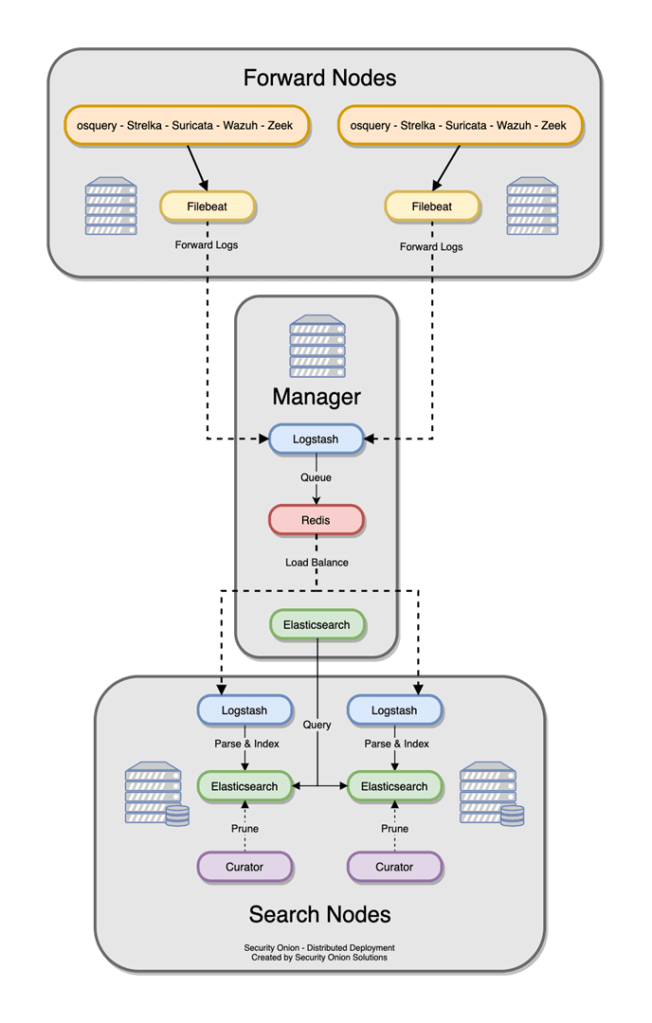 Şekil 3.2’de görüldüğü gibi dağıtık mimaride depolama, analiz, log toplamadan görevli olan yönlendirici düğümler birbirinden ayrılmıştır. Standart bir dağıtılmış dağıtım, bir yönetici düğümü, ağ sensör bileşenlerini çalıştıran bir veya daha fazla yönlendirme düğümü ve elasticsearch bileşenleri çalıştıran bir veya daha fazla arama düğümünü içerir.