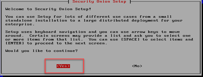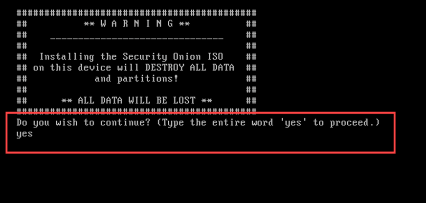 Security Onion Kurulum ekranında aşağıda gösterildiği gibi “yes” seçilerek kuruluma devam edilir.