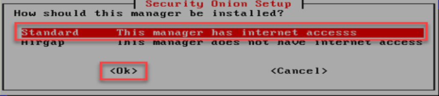 Security Onion kurulum ekranında sunucun internete erişimi olup olmadığı sorulmaktadır. Sunucunun direk internete erişimi olduğu için “Standard” seçilerek kuruluma devam edilir.