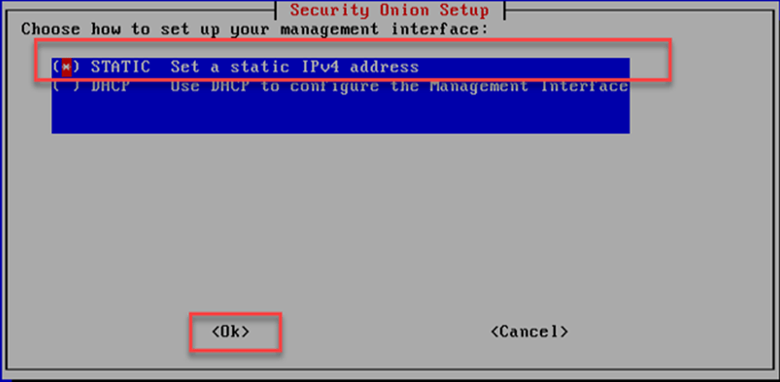 Security Onion kurulum ekranında yönetim arayüzünün ip adresini yapılandırmak için gösterildiği gibi “STATIC” seçilerek kuruluma devam edilir.