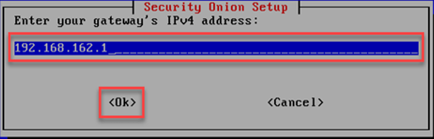 Security Onion kurulum ekranında ağ geçidi gösterildiği gibi yazılarak kuruluma devam edilir.