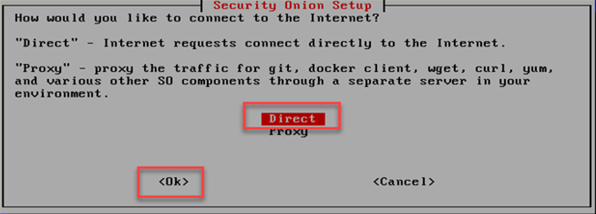 Security Onion kurulum ekranında sucunun internete bir vekil (Proxy) sunucudan mı yoksa direk mi çıktığı sorulmaktadır. Direk internete çıkıyorsa gösterildiği gibi “Direct” seçilerek kuruluma devam edilir.