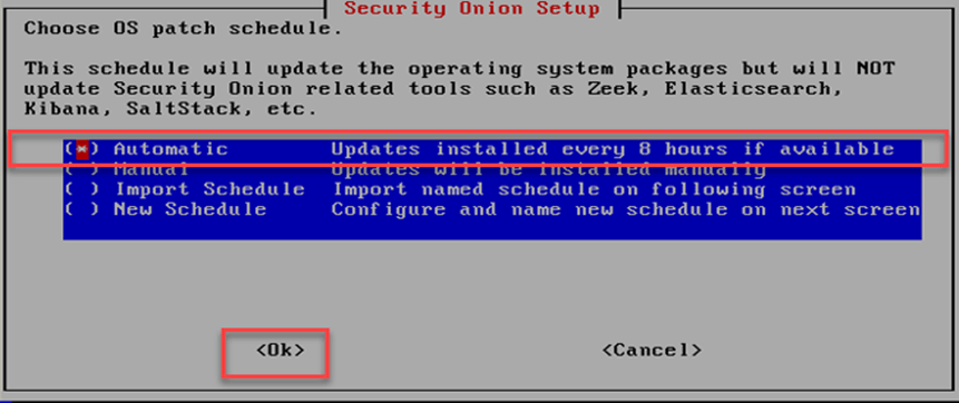 Security Onion kurulum ekranında işletim sistemi yamaların nasıl yapılacağı seçilerek kuruluma devam