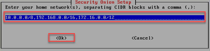 Security Onion kurulum ekranında kurum iç ağları gösterildiği gibi yazılarak kuruluma devam edilir. Farklı ip blokları varsa onlarda eklenmelidir.