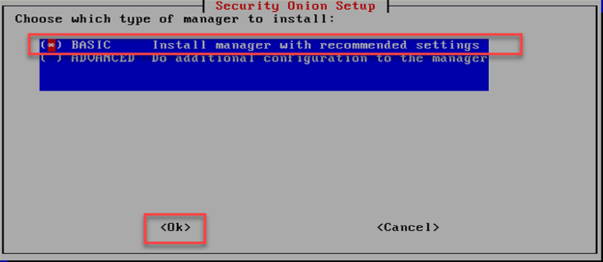 Security Onion kurulum ekranında Şekil 3.27’de gösterildiği gibi “BASIC” seçilerek kuruluma devam edilir. ADVANCED seçeceğinde bileşenlerin İşlemci, Bellek, Loglar ve elasticsearch’in konfigürasyonları yapılmaktadır. İlk kez kurulum yapılacaksa “BASIC” seçilmelidir.