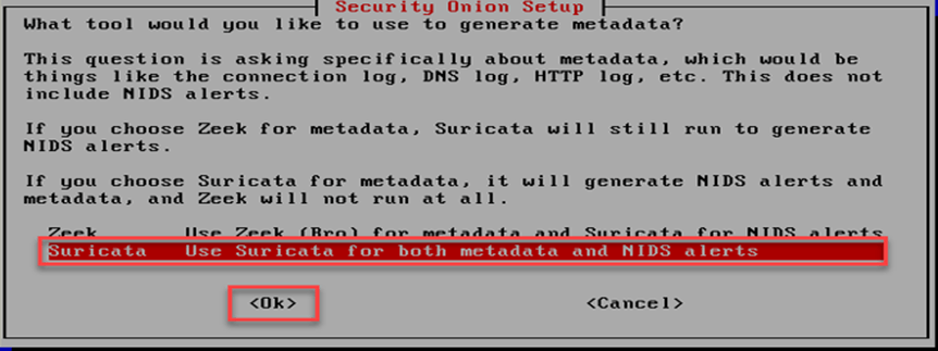 Security Onion ekranında ağ tabanlı saldırı tespit sisteminin ne olacağını seçilmelidir. “Suricata” seçilerek kuruluma devam edilir.