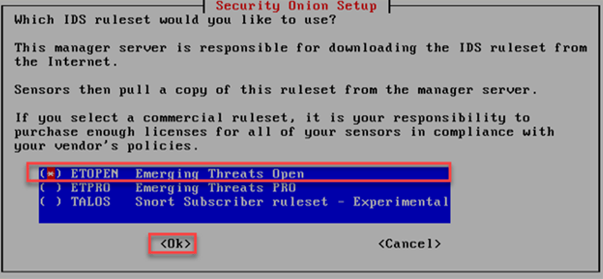 Security Onion kurulum ekranında Ağ Tabanlı Saldırı tespit sisteminin kural setini yapılandırması için “ETOPEN” seçilerek kuruluma devam edilir. ETPRO Ücretli üyelik gerektirmektedir