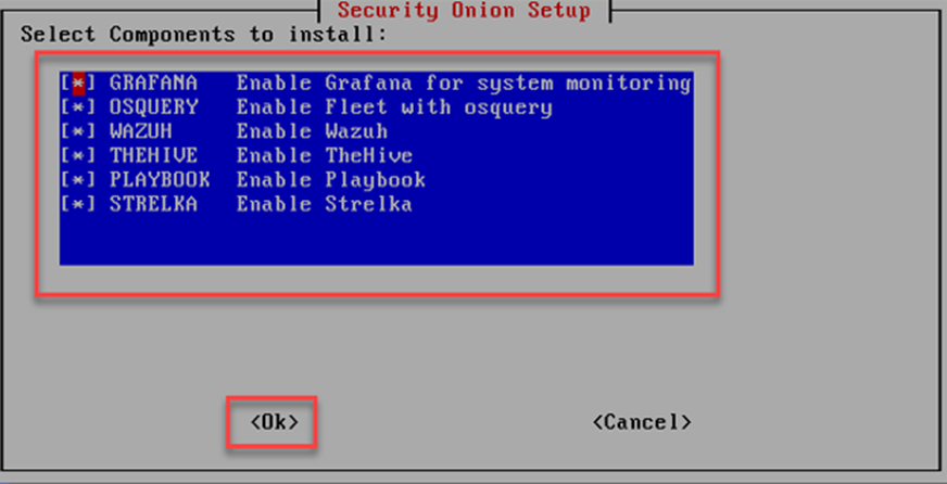 Security Onion kurulum ekranında hangi bileşenlerin kurulacağı seçilmelidir. Kurulumdaki bütün bileşenler inceleceği hepsi seçilerek kuruluma devam edilir.