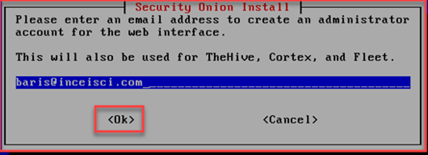 Security Onion kurulum ekranında TheHive, Cortex ve Fleet bileşenleri için yönetici hesabının e-posta adresi sorulmaktadır. E-posta adresi ve şifresi yazılarak kuruluma devam edilir.