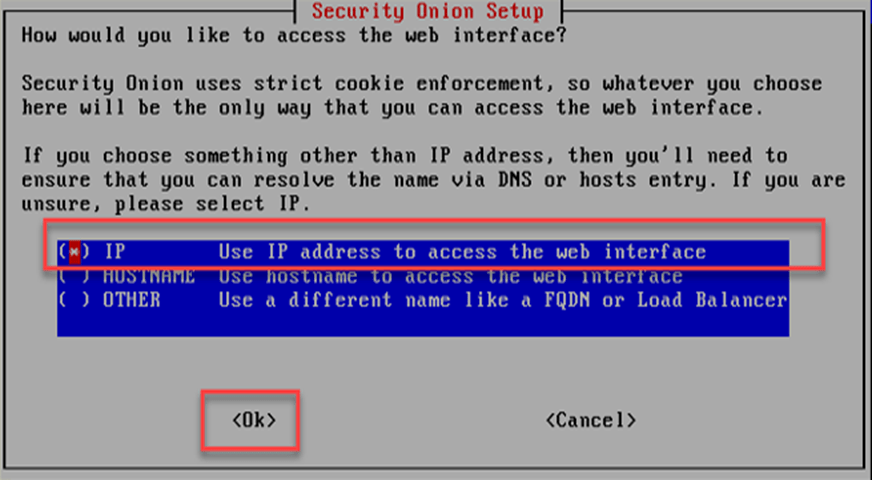 Security Onion ekranında web arayüzüne erişimin nasıl olacağı sorulmaktadır. DNS kaydı yapıldıysa hostname seçilir. DNS kaydı yapılmadıysa “IP” seçilerek kuruluma devam edilir.
