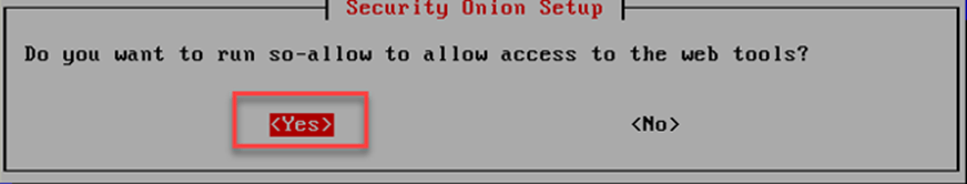 Security Onion kurulum ekranında so-allow kullanıcı ile web araçlarına erişmek için Şekil 3.41’de gösterildiği gibi “yes” seçilerek kuruluma devam edilir.