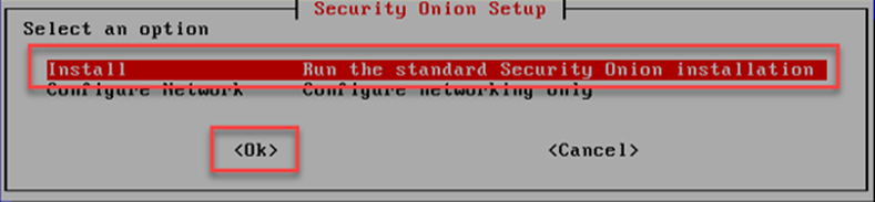 Security Onion setup ekranında gösterildiği gibi “Install” seçilerek standart olarak kuruluma devam edilir.