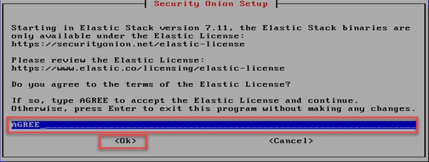 Security Onion kurulum ekranında lisans sözleşmesi “AGREE” yazılarak kabul edilir ve “OK” seçilerek kuruluma devam edilir.
