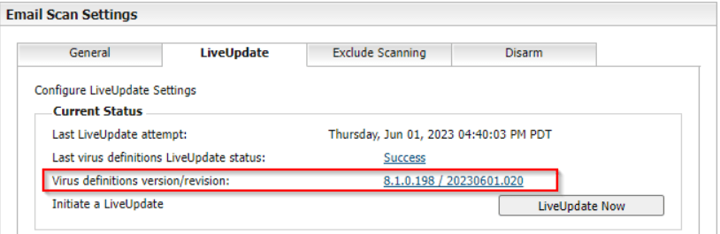 Malware > Email Scan Settings > Liveupdate bölümünden Liveupdate güncellemesi yaparak güncellemeleri alabilirsiniz.