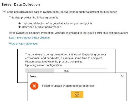 Symantec Endpoint Protection Manager 14.3 RU5 kurulumu sırasında ”Failed to update system configuration file” hatastını alıyorsanız ve log dosyalarında da aşağıdaki hata çıkıyorsa Bcp.exe dosyasını bulamadığı içindir. SQL ClientSDK dosyasını C:\Program Files\Microsoft SQL Server klasorune kopyalayın ve sonrasında Configuration Management Wizard’ı çalıştırınız.