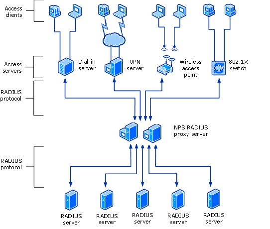 NPS bir RADIUS sunucu, bir RADIUS proxy sunucu veya ikisi bir arada olarak kullanılabilir.